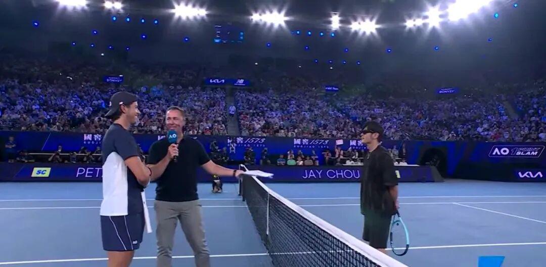 周董这次参加的是澳网期间的特别娱乐赛事One Point Slam(“一球制胜”)。